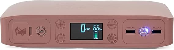 Portable Charging Asset: Recharge your phone or other electronic devices via the dual USB charging ports. Plus, the LCD digital display indicates battery life and tire pressure