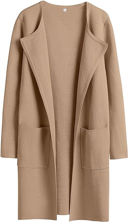 - Features – Open front. Pockets. Lapel Neckline. Knit fabric provides flexibility. Not lined.